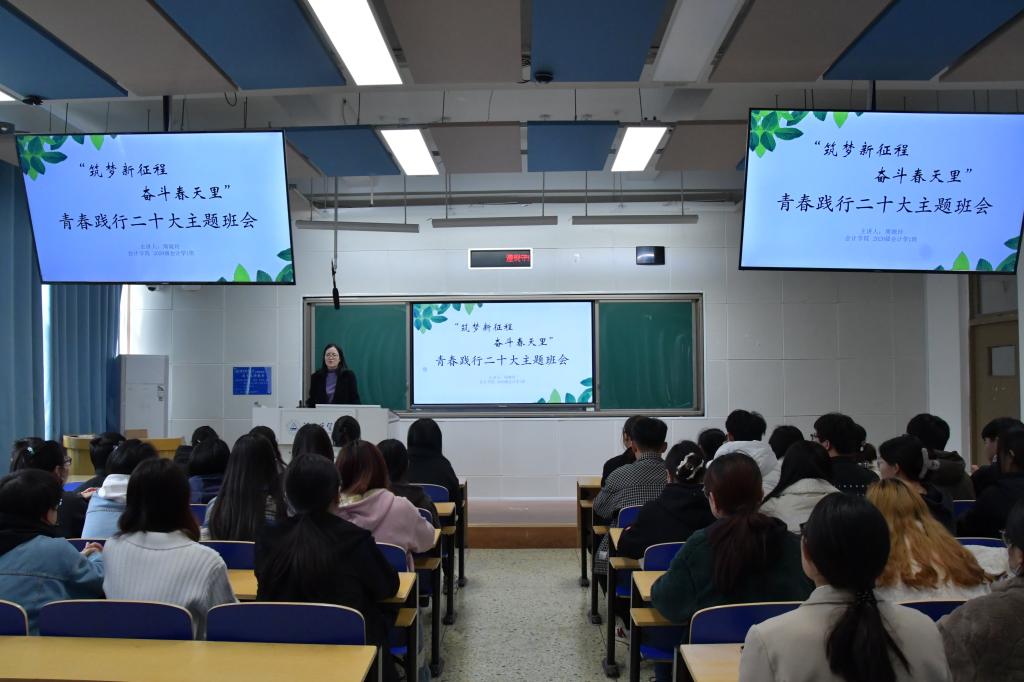为引导青年老员工深入学习贯彻党的二十大精神,坚定理想信念,厚植爱国情怀,凝聚思想共识,推动二十大精神“入脑入心入行”,3月17日下午,公司组织公司师生在三教A103观摩2020级会计1班“逐梦新征程奋斗春天里”青春践行二十大主题班会,院团委书记周晓玲主讲。公司党委书记赵文报、副书记程丽梅及全体辅导员出席本次观摩活动,2020级会计1班全体同学参加。
