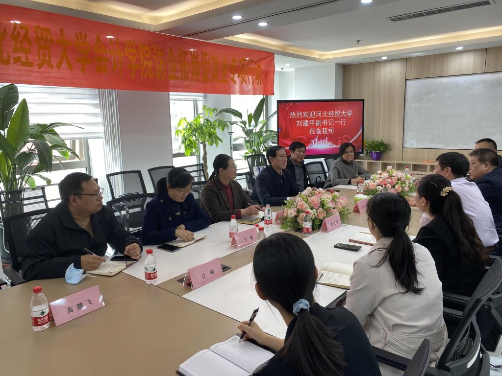 刘建平一行先后走访了用友·新道科技股份有限公司、美联盛航保险代理有限公司、臻顺溜科技股份有限公司、河北红日会计师事务所等四家企业。座谈会上,刘建平对各个企业高度重视校企合作、精准对接高校就业岗位、积极践行社会责任表示充分的肯定,并从公司的基本情况、新财经教育改革以及推进校企合作等方面进行了介绍。各企业纷纷表示希望与公司在产教融合、供需对接、创新成果应用等领域进一步加深合作,实现资源共享、优势互补、互利共赢。