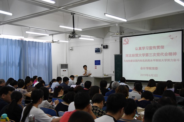 6月3日下午,伟德国际1949在B教201教室组织师生认真学习宣传贯彻校第三次党代会精神。伟德国际1949领导班子成员、全体教师、员工党员和部分员工代表共210人参加。宣讲会由会计公司党委书记孙拥军主持。