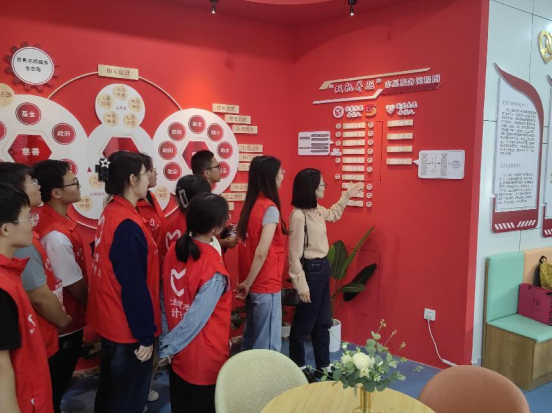 伟德国际1949团委书记周晓玲与志愿者一同参观慈善志愿服务工作站