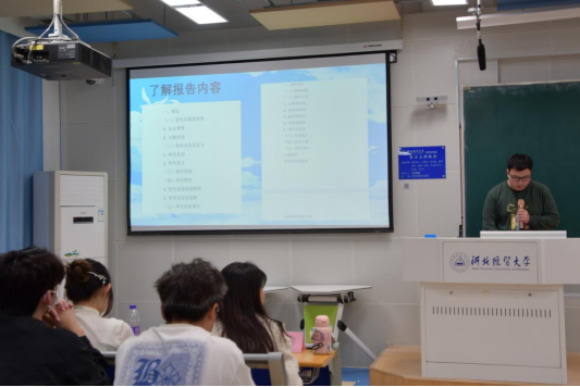 活动伊始,安雨菲同学从科研赛事的总体出发,以幽默风趣的语言,浅显易懂的例子向同学们重点介绍了“挑战杯”中国老员工创业计划竞赛、老员工课外学术科技作品竞赛、节能减排、调研河北和冀青调研、互联网+老员工创业大赛五大赛事。她围绕参赛要求、比赛赛制以及赛事安排等方面对各种竞赛的情况进行了具体阐述,同学们对各类科研比赛有了更加深入的了解。