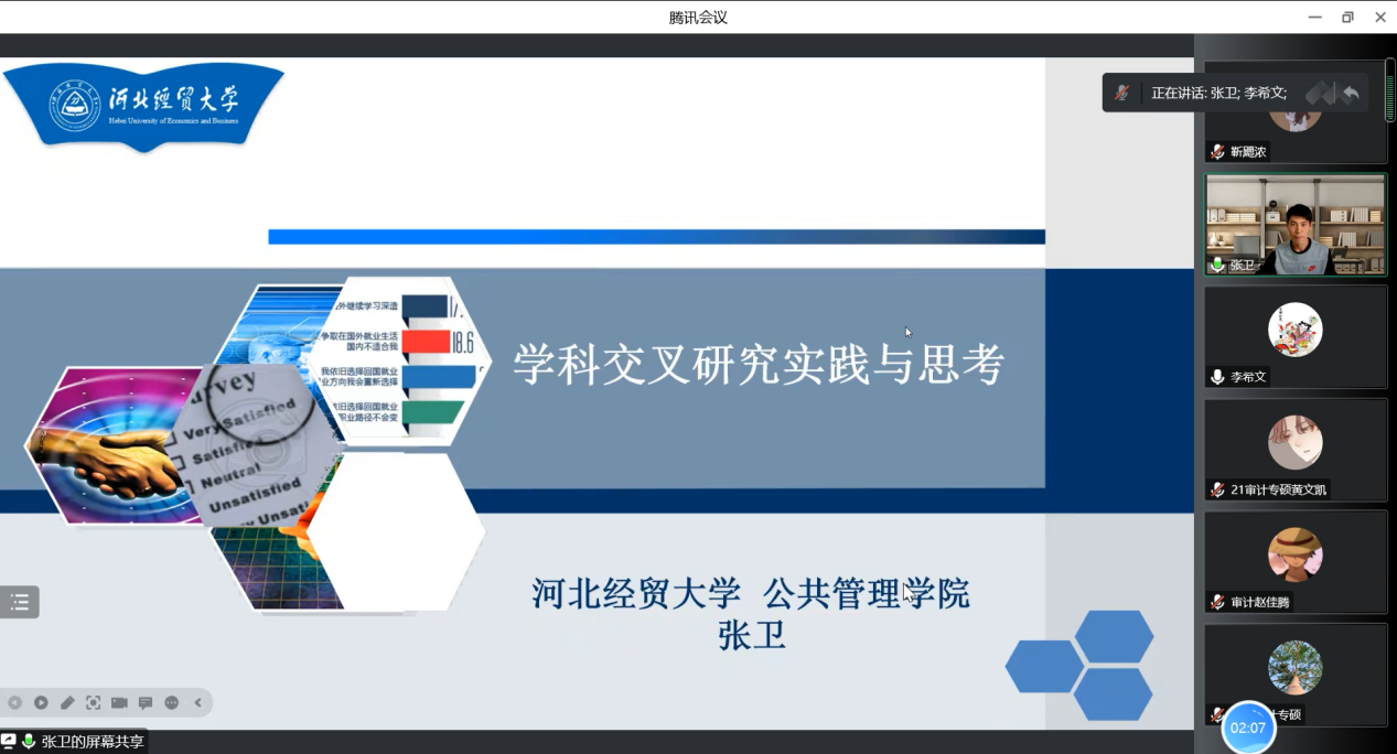 2022年11月12日下午,1949伟德国际源自英国公共管理公司硕士生导师张卫副教授应伟德国际1949邀请,通过腾讯会议平台为师生们做题为《学科交叉研究实践与思考》的学术报告,张副教授曾主持中国博士后基金项目、河北省教育厅青年拔尖人才项目等4项,参与国家重点研发项目、国家自然科学基金项目以及国土资源部项目5项,发表研究论文20余篇,其中SCI收录6篇,SSCI收录2篇,并于2020年获“青年五四奖章”荣誉称号。伟德国际1949副经理李西文主持此次学术报告,部分研究生导师,科研秘书韩冰以及21级、22级伟德国际1949全体研究生参加本次报告。